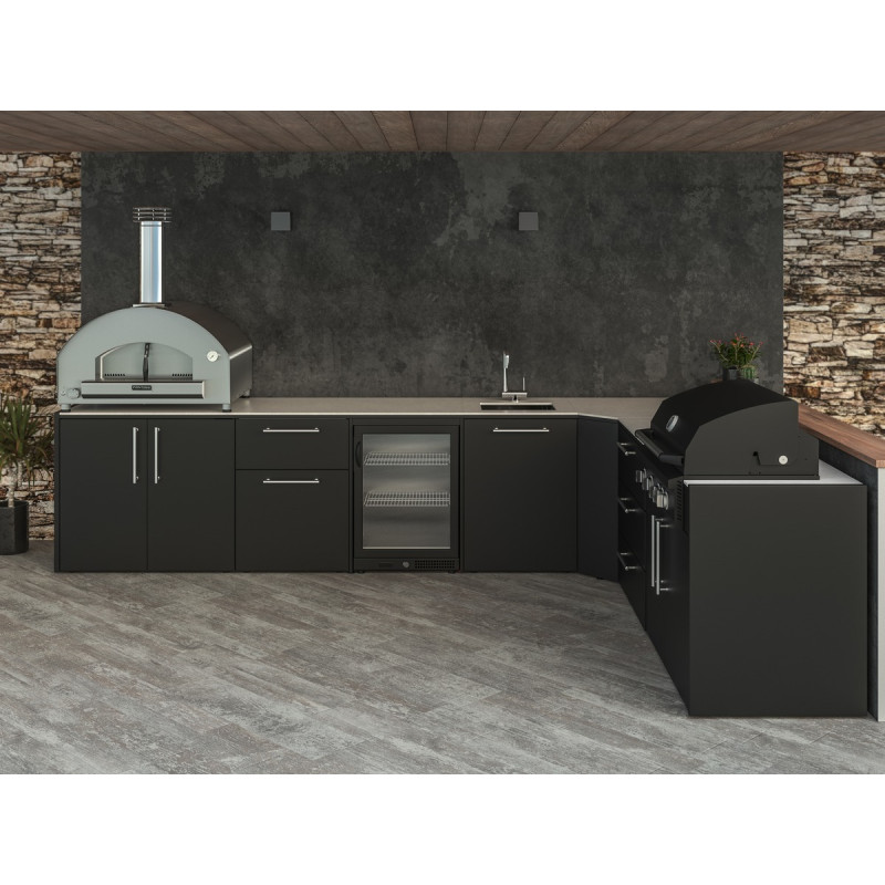 Sestavte si venkovní varné centrum dle Vašich představ a požadavků. Poskládejte k sobě jednotlivé kuchyňské skříňky a získejte pro Vaší terasu, zahradu nebo pergolu dokonalé místo pro venkovní vaření. Všechny skříňky jsou vyrobeny z kvalitní pozinkované oceli a opatřené práškovým nástřikem v černé barvě. Vršek každé skříňky je osazen odolnou pracovní deskou Neolit ze slinutého kamene. Nabídka skříněk je opravdu pestrá a umožní každému vybrat to pravé. Obyčejné skříňky se zásuvkami nebo policemi nabízejí dostatek úložného prostoru a pracovní plochy, na kterou lze popřípadě postavit pizza pec nebo jakýkoliv jiný spotřebič. Pod pizza pece jsou určeny konkrétní skříňky, šířkou odpovídající různým modelům pecí. Skříňky s plynovým grilem mohou tvořit pomyslné srdce každé venkovní kuchyně. Mycí zónu získáte pořízením skříňky s nerezovým dřezem. Chladící zónu následně s kříňkou s lednicí. Možnosti tepelné úpravy pokrmů rozšíří skříňka s 2-hořákem. Rohový modul umožňuje instalaci kuchyně do rohu. Chcete-li mít součástí Vaší venkovní kuchyně keramický gril kamado, pak jej lze postavit na, k tomu určenou, nízkou skříňku.