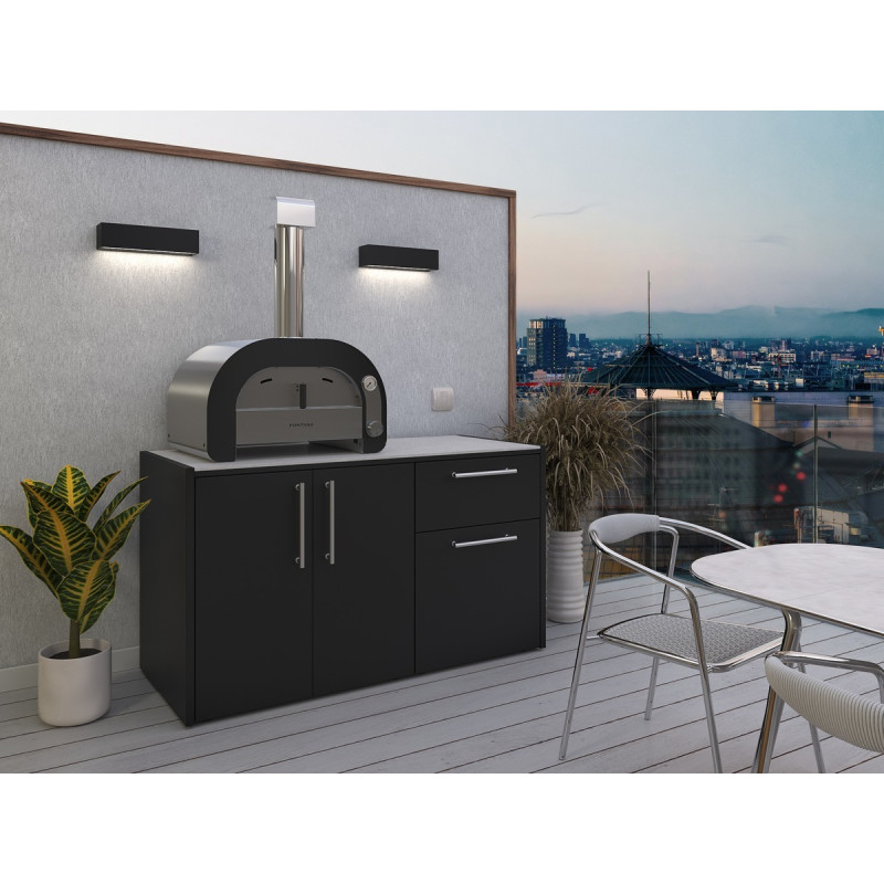 Sestavte si venkovní varné centrum dle Vašich představ a požadavků. Poskládejte k sobě jednotlivé kuchyňské skříňky a získejte pro Vaší terasu, zahradu nebo pergolu dokonalé místo pro venkovní vaření. Všechny skříňky jsou vyrobeny z kvalitní pozinkované oceli a opatřené práškovým nástřikem v černé barvě. Vršek každé skříňky je osazen odolnou pracovní deskou Neolit ze slinutého kamene. Nabídka skříněk je opravdu pestrá a umožní každému vybrat to pravé. Obyčejné skříňky se zásuvkami nebo policemi nabízejí dostatek úložného prostoru a pracovní plochy, na kterou lze popřípadě postavit pizza pec nebo jakýkoliv jiný spotřebič. Pod pizza pece jsou určeny konkrétní skříňky, šířkou odpovídající různým modelům pecí. Skříňky s plynovým grilem mohou tvořit pomyslné srdce každé venkovní kuchyně. Mycí zónu získáte pořízením skříňky s nerezovým dřezem. Chladící zónu následně s kříňkou s lednicí. Možnosti tepelné úpravy pokrmů rozšíří skříňka s 2-hořákem. Rohový modul umožňuje instalaci kuchyně do rohu. Chcete-li mít součástí Vaší venkovní kuchyně keramický gril kamado, pak jej lze postavit na, k tomu určenou, nízkou skříňku.