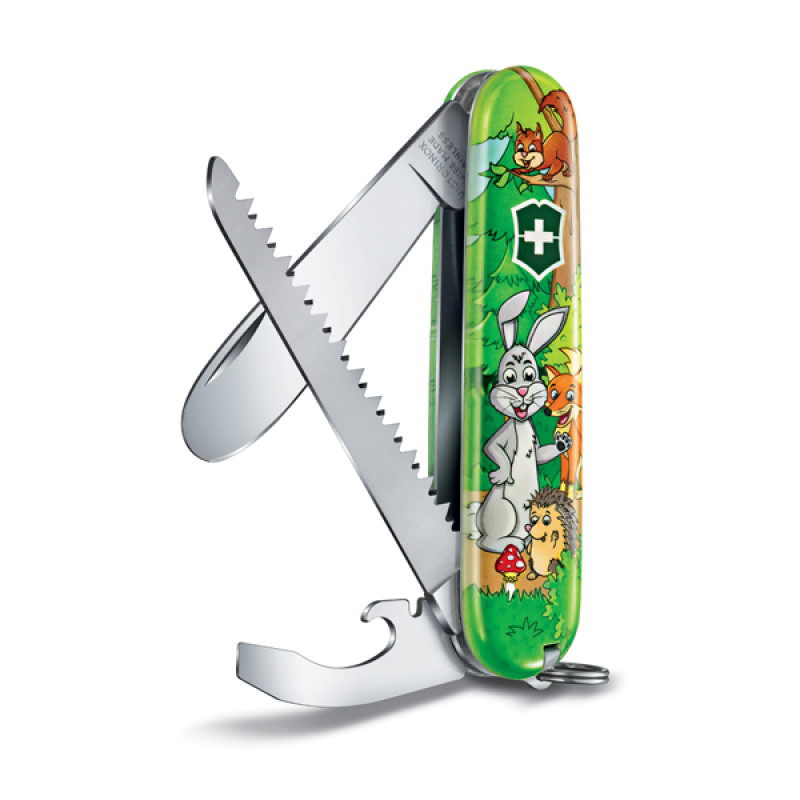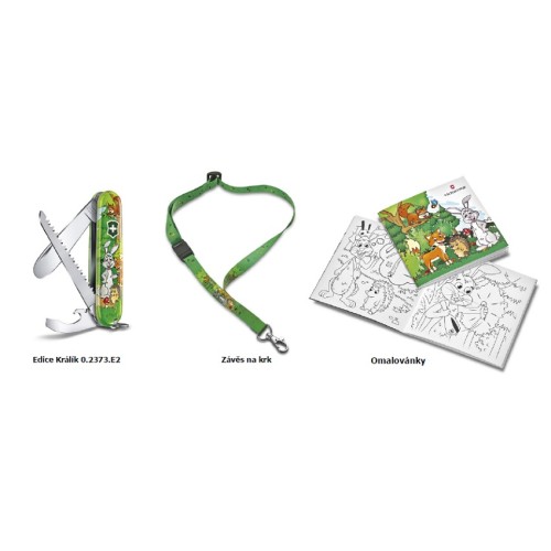 Zábavná sada Můj První Victorinox, je perfektní dárek pro odvážné a zvídavé děti. Sada se skládá z nože, závěsu na krk a omalovánek, které mimo jiné ukazují, jak bezpečně pracovat s nožem (za dozoru dospělé osoby). Na výběr jsou motivy chytrého delfína, drzého papouška a odvážného králíka. Zavírací nůž má kulatou špici pro větší bezpečnost. Nejedná se o hračku! Výrobek je plnohodnotný zavírací nůž s ostrou čepelí. Práce dětí s nožem je možná pouze pod dozorem dospělé osoby.