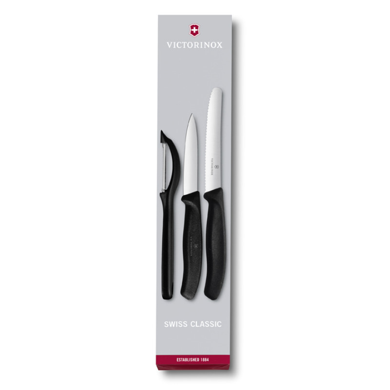 Praktická sada obsahuje nůž na zeleninu, loupací nůž a univerzální škrabku. Výborně využijete při činnostech vyžadujících přesnost, např. při zpracování ovoce, zeleniny apod. Nože a škrabka mají plastové rukojeti ergonomického tvaru pro snadnější a komfortnější držení v ruce.