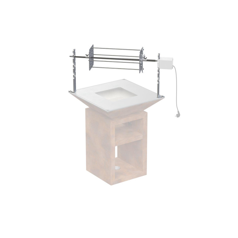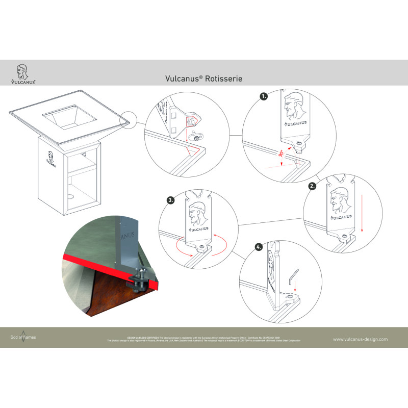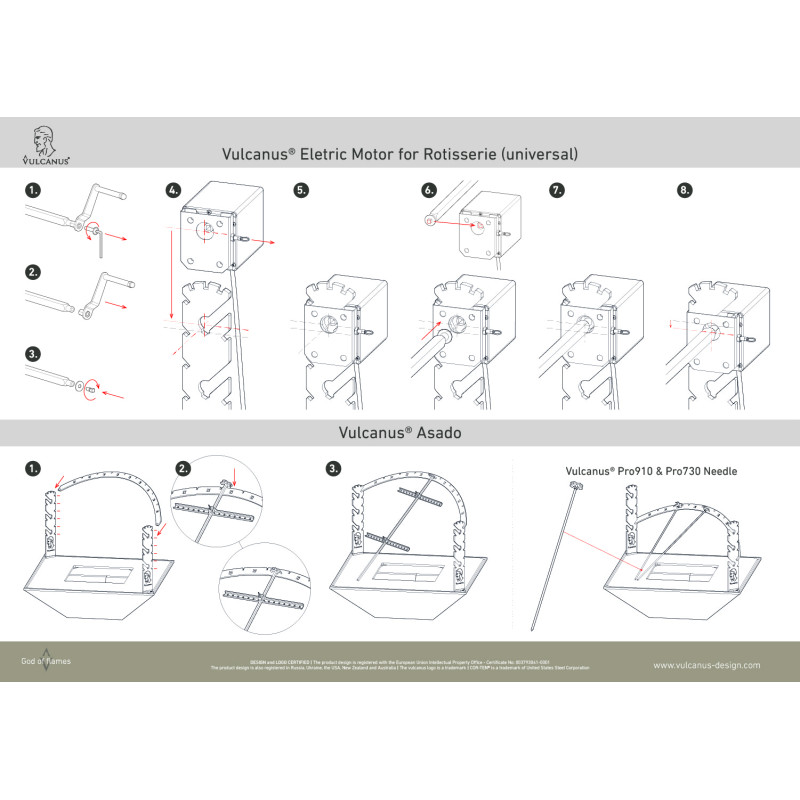 Nekompromisní výkon motoru (příslušenství) je 40 kg. Veškeré části Rotisserie jsou vyrobené z masivní nerezové oceli, pro maximální životnost, tak jak jste u produktů Vulcanus zvyklí. Masivní nosné nohy jsou z 10 × 80 mm silné nerezové oceli a hlavní Rotisserie je vyrobená z plného nerezového čtyřhranu 16 × 16 mm. Sestava je doplněna dvěma přítlačnými talíři s více než padesáti polohami a čtyřmi jehlami, pro maximální variabilitu zajištění surovin. Standardně je sestava vybavena klikou, kterou můžete aretovat v šesti polohách, nebo ji během vteřiny nahradit za motor (příslušenství). Hlavní nohy Rotisserie mají připravené polohy pro doplnění o grilovací systém ASADO, nebo držadla jehly pro ořezávání masa.