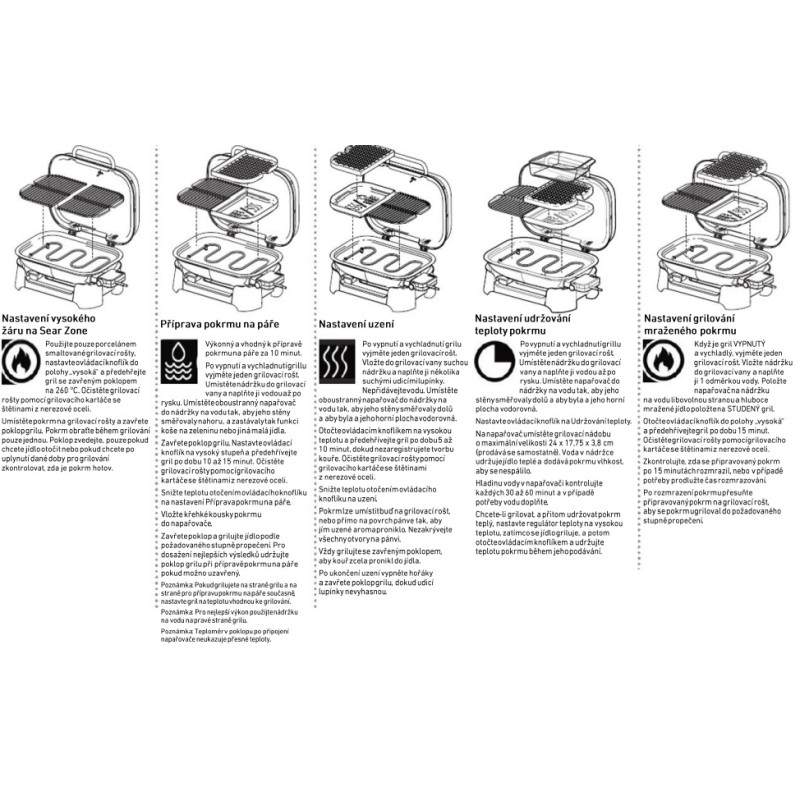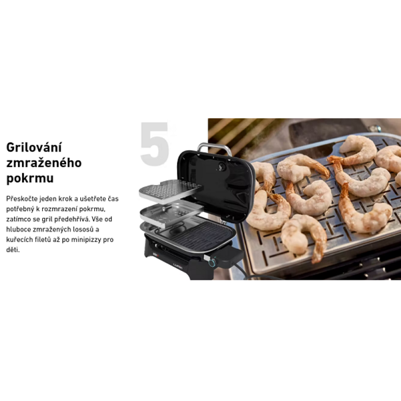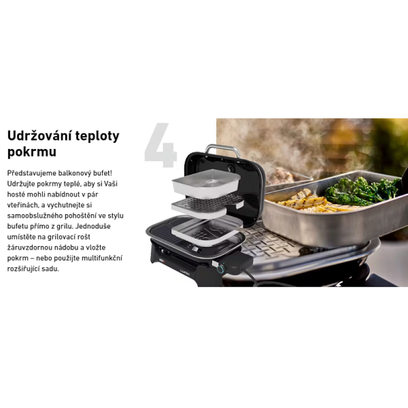 Součástí grilu je nerezová miska s napařovákem, samostatně lze pak ke grilu dokoupit litinovou planchu nebo multifunkční sadu, která obsahuje druhou nerezovou misku s napařovákem (pak budete mít napařovák pro obě půlky grilu) a dvě větší nerezové mísy na servírování a udržení jídla na teple bez grilování. Sklopný stojan, který je již součástí, lze snadno rozložit a poskytuje další místo pro odložení nepotřebných věcí nebo zavěšení náčiní na vestavěné háčky.