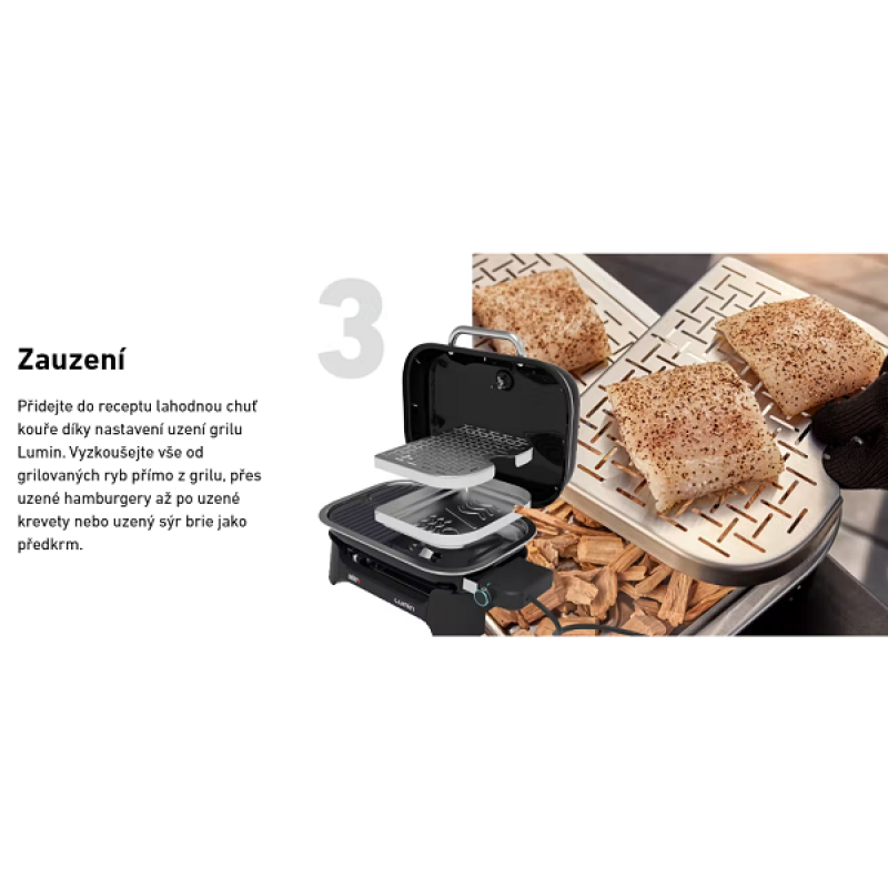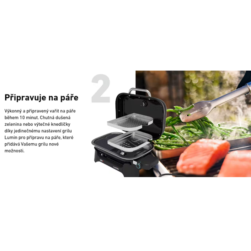 Multifunkční gril se stojanem (menší verze grilu LUMIN), na kterém zvládnete vše od přímého grilování až do 315 °C, kde ugrilujete sebedokonalý steak tak až přes přípravu jídla v páře nebo douzování. Elektrický gril Lumin se vyznačuje vysokým žárem a velkou všestranností. Posouvá venkovní grilování ve městě do nových výšin. Je vyvinut přednostně pro balkóny městských bytů a terasy. Nový elektrický gril Lumin je moderní a praktický a je navržen tak, aby vyhovoval Vašemu vkusu i venkovním prostorám - rozmanitost přípravy pokrmů - napařování, grilování, uzení, rozmrazování a ohřívání. Výkon uvnitř grilu zajišťuje jedna plynule nastavitelná topná spirála, která rovnoměrně distribuje teplo po celé grilovací ploše. Gril je vybaven dvoudílným porcelánem smaltovaným litinovým roštem, který převádí teplo a nebo ho můžeme zaměnit třeba za litinovou planchu nebo multifunkční sadu a gril tak zvládne připravovat jídla i v jiných režimech (napařování, uzení, rozmrazování a ohřívání).