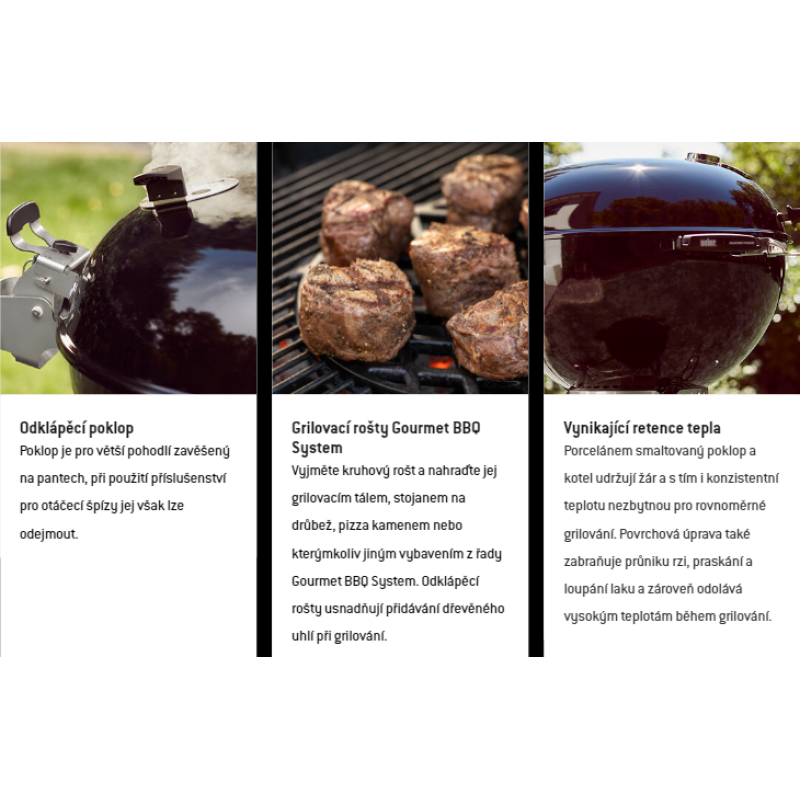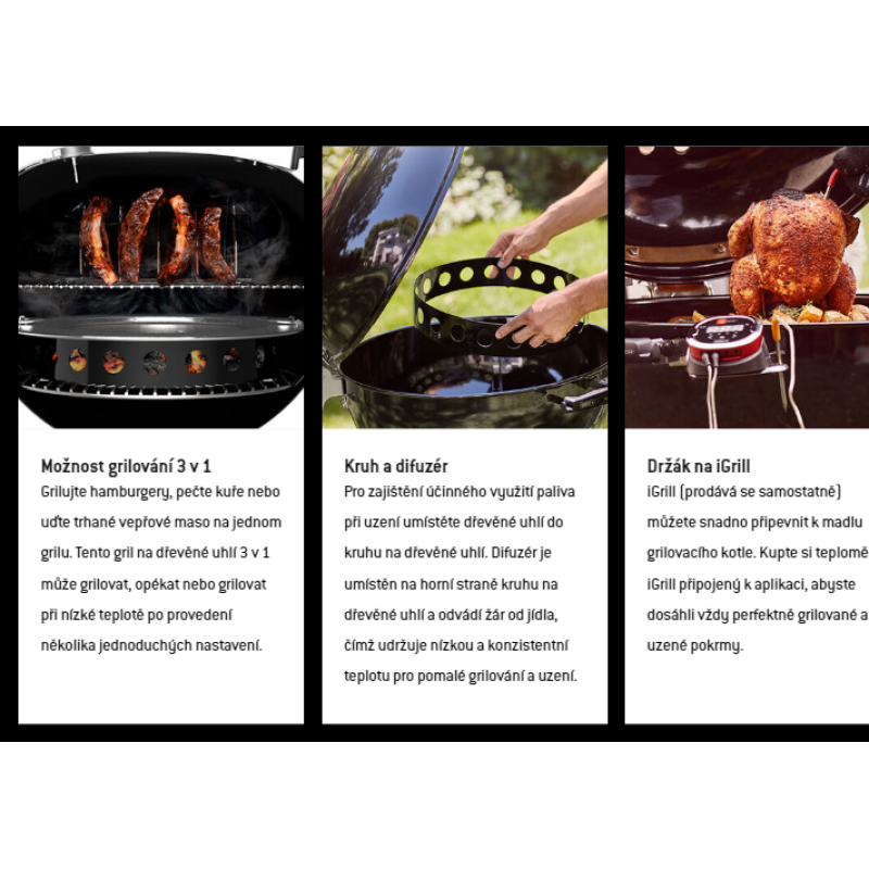 Na grilu na dřevěné uhlí Master-Touch Premium 3 v 1 můžete díky systému Gourmet BBQ Systém grilovat na přímém i nepřímém žáru cokoliv od steaků (litinový grilovací rošt GBS je součástí balení) přes šťavnaté trhané vepřové až po dezerty. Díky novým vlastnostem jako jsou poklop na praktickém masivním pantu nebo třeba difuzéru s kruhovou přepážkou na palivo. Toto příslušenství umožňuje na daném grilu kromě klasického přímého grilování také grilovat ve světě stále populárnější metodou Low & Slow, kdy jsou pokrmy připravovány několik hodin pro dokonalejší výsledek grilování. Difuzér zároveň umožňuje na grilu také udit. Perfektní cirkulace vzduchu pro tyto metody je zajištěna také díky již zmiňovaným, nastavitelným průduchům v poklopu a kotli grilu.
