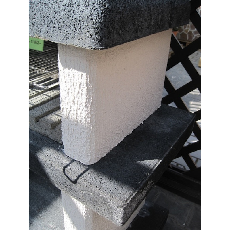 Praktický zahradní krb s odkládací plochou, dodávaný jako stavebnice v provedení bez povrchové úpravy (betonově šedá barva) s černě probarvenou střechou, základovoudeskou a pracovní deskou. Výškově stavitelný chromovaný grilovací rošt, dvoudílná deska ohniště.
