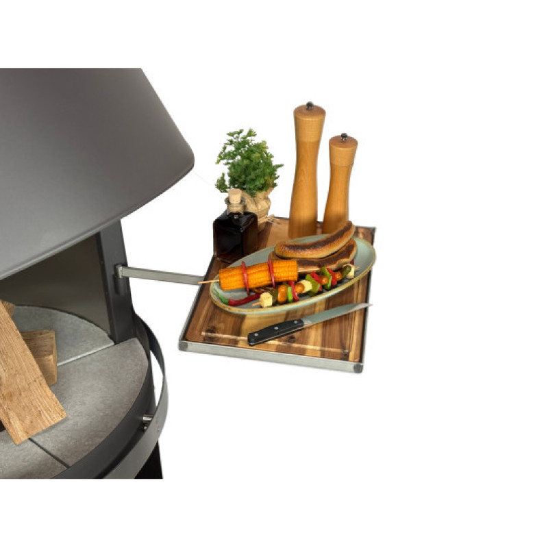S našimi novými praktickými závěsnými stolky můžete svůj gril Firestar proměnit v plnohodnotnou venkovní kuchyni. Ať už na krájení masa, krájení zeleniny nebo odkládání příslušenství grilu a chlazeného nápoje. Kvalitní dřevěná deska je dodávána v masivním nerezovém rámu. Obvodová drážka zajišťuje čistou práci. Vhodné pro všechny modely venkovních krbů Firestar.